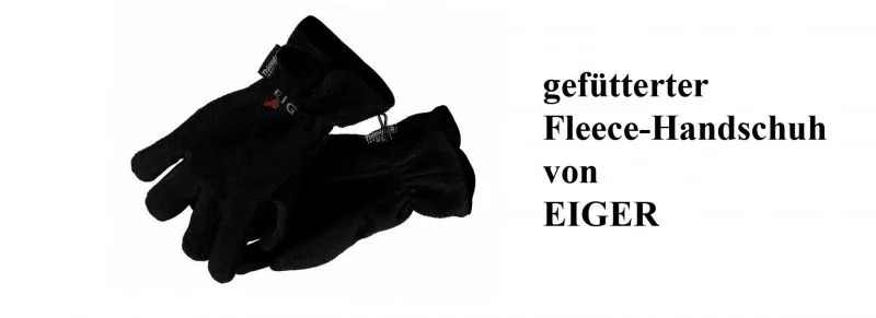 Ein warmer Fleece von Eiger. Aber auf dem langen Weg zur Angelstelle werden die Finger doch kalt und hier leistet der Fleece Handschuh gute Dienste. Man bekommt die Handschuhe durch auswringen und ausschütteln fast trocken und die Handschuhe wärmen auch feucht noch.
