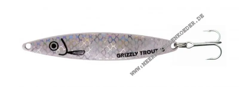 Der Grizzly Trout ist ein klassisch ausgeformter Blinker, der extrem fängig für Meerforelle, Dorsch, Hornhecht, Wolfsbarsch ,Forelle und Lachs in Seen und Fliessgewässern ist. Der Blinker wird aus feinstem Edelstahl ausgestanzt, wonach er mit einer Reflex Schuppenmusterfolie beklebt und dann mit erprobten Farbkombinationen lackiert wird. Alle Blinker sind mit erstklassigen rostfreien Splitringen und starken Drillingshaken von Mustad ausgestattet.
