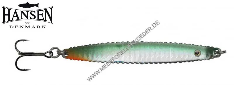 Spezieller Weitwurfblinker, entwickelt von Kent Andersen für Hansen of Denmark. Das innovative neue Blinker Design imitiert einen Seeringelwurm und verursacht unter Wasser verführerische Turbulenzen. Die Meerforellen lieben Seeringelwürmer und lassen sich diesen Leckerbissen sicher nicht entgehen. Man muß diesen Köder gefischt haben um alle Vorzüge kennen zu lernen. Den Lotus Blinker kann man langsam und auch schnell führen, sehr gut werfen und er fängt Meerforellen und Wolfsbarsch gleichermaßen.