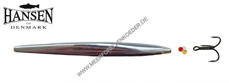 Durch das zusätzliche Gewicht am Schwanz wirft der Mefo-Inliner sich auch super gegen den Wind. Beim Spinstop sinkt der Meerforellenblinker zuerst mit dem Heck ab, so wie echte Tobiasfische die sich im Sand eingraben wollen. Durch diesen Reiz wurden schon viele Meerforellen überlistet. Die neuen Hansen Durchlaufköder werden mit 3 Stück Knotenschutzperlen und super scharfen BKK Drilling mit Sprengring im Blister geliefert. Die Hansen Silver Arrow Inline Blinker sind einzeln verpackt.