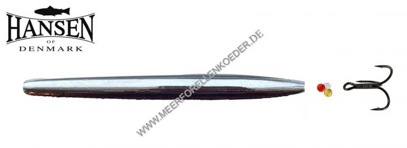 Durch das zusätzliche Gewicht am Schwanz wirft der Mefo-Inliner sich auch super gegen den Wind. Beim Spinstop sinkt der Meerforellenblinker zuerst mit dem Heck ab, so wie echte Tobiasfische die sich im Sand eingraben wollen. Durch diesen Reiz wurden schon viele Meerforellen überlistet. Die neuen Hansen Durchlaufköder werden mit 3 Stück Knotenschutzperlen und super scharfen BKK Drilling mit Sprengring im Blister geliefert. Die Hansen Tobis Inline Blinker sind einzeln verpackt.