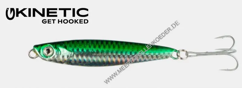 Der Kinetic Cool Herring ist ein Minipilker mit 25g Wurfgewicht. Durch die Kompakte Form von 75mm kann man ihn sehr gut werfen. Der Pilker läuft aber nicht ohne Aktion durchs Wasser sonder beim Einholen schwänzelt er von rechts nach links.  Das Besondere an dem Minipilker sind die 3-D Augen. Der Pilken hat auch schon viele Barsche und Rapfen überlistet aber auch Hornhechte lassen sich gut fangen. Wer den Köder etwas langsamer führt kann auch Meerforelle und Wolfsbarsch fangen. Über den Grund gezockt wurden auch schon schöne Zander gefangen.
