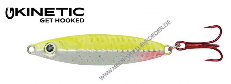 Der Kinetic Dragon ist ein Minipilker mit 25g Wurfgewicht. Durch die 3eckige Kompakte Form von 70mm kann man ihn sehr gut werfen. Der Pilker läuft aber nicht ohne Aktion durchs Wasser sonder beim Einholen schwänzelt er von rechts nach links. Das Besondere an dem Minipilker sind die UV aktiven Augen. Der Pilken hat auch schon viele Barsche und Rapfen überlistet aber auch Hornhechte lassen sich gut fangen. Wer den Köder etwas langsamer führt kann auch Meerforelle und Wolfsbarsch fangen. Über den Grund gezockt wurden auch schon schöne Zander gefangen.