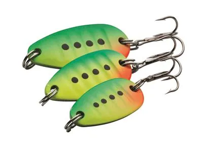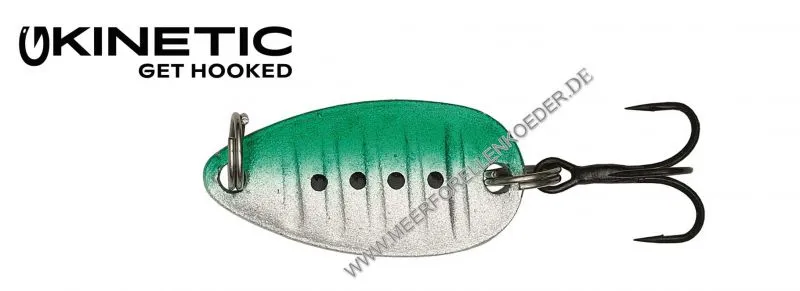 Der kleine Kinetic Oersta ist ein Universal Blinker. Man kann damit gut flache Buchten absuchen aber auch prima im Fluß auf Bachforellen fischen. Der Ørsta wird in Dänemark auch viel an Put and Take See eingesetzt wo er Regenbogen- und Lachsforellen überlistet. Die Köder lassen sich gut werfen und zeigen beim einkurbeln ein verführerischen Lauf. Das Überlistet auch viele Fische am Forellensee / Angelteich. Man kann den kleinen Spezial-Blinker auch hinter einem Spirolino /  Bombarde fischen. So erreicht man größere Wurfweiten und fängt auch Fische die sonst nicht zu erreichen waren. Die  Ørsta Blinker sind mit chemisch geschärften Black Nickel Drillingen ausgestattet. Der Oersta Blinker imitiert eine kleines Fischchen und hat schon viele Forellen überlistet.