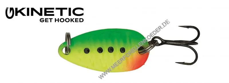 Der kleine Kinetic Oersta ist ein Universal Blinker. Man kann damit gut flache Buchten absuchen aber auch prima im Fluß auf Bachforellen fischen. Der Ørsta wird in Dänemark auch viel an Put and Take See eingesetzt wo er Regenbogen- und Lachsforellen überlistet. Die Köder lassen sich gut werfen und zeigen beim einkurbeln ein verführerischen Lauf. Das Überlistet auch viele Fische am Forellensee / Angelteich. Man kann den kleinen Spezial-Blinker auch hinter einem Spirolino /  Bombarde fischen. So erreicht man größere Wurfweiten und fängt auch Fische die sonst nicht zu erreichen waren. Die  Ørsta Blinker sind mit chemisch geschärften Black Nickel Drillingen ausgestattet. Der Oersta Blinker imitiert eine kleines Fischchen und hat schon viele Forellen überlistet.