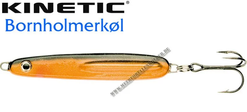 Der Kinetic Bornholmerkøl ist ein flacher Blinker mit einer angegossenen Flosse. Er hat die Form der Originalen Bornholmer. Die Köder lassen sich sehr gut werfen und zeigen beim Spinstop ein verführerisches abtaumeln. Die  Kinetic Bornholmerkøl  Blinker sind nur mit besten Komponenten ausgestattet wie z.B. VMC 9649 BN Drillingen. Der Bornholmerkøl imitiert ein kleines Fischchen  und hat er schon viele Meerforellen und Dorsche überlistet.