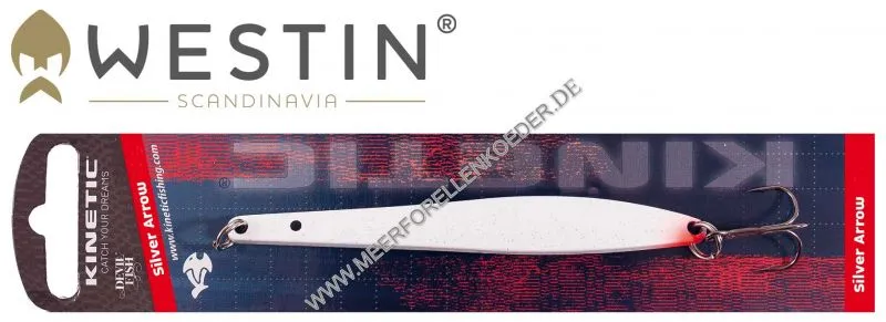 Dieser Köder wurde für das Wurfangeln auf Meerforelle entworfen. Der Körper des Köders ist am Ende leicht gebogen so bekommt der Blinker einen schönen schwänzelnden Lauf. Dieser spielerisch tänzelnden Lauf hat schon viele Meerforellen, Dorsche aber auch feinste Wolfsbarsche verführt. Weil der Silver Arrow hinten breiter ist als vorn ist auch mehr Gewicht am Ende und man wirft so sehr weit und genau aus. Der Meerforellenblinker soll ein kleines Fischchen z.B. einen kleinen Tobis oder einen Sandaal imitieren. Die Tobisblinker sind mit guten Komponenten ausgestattet wie z.B. super scharfen Black Nickel Drillingen.