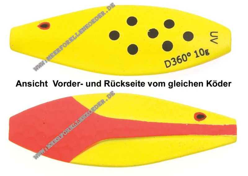 Die Forelle 10g -Version ist für Put & Take- Angeln am Forellen See konzipiert. Wenn die Fische vorsichtig beißen kann der D360 °mit extrem langsamen Tempo gefischt werden. Die verschiedenen Kontrastfarben auf Vorder und Rückseite machen oft auch einen großen Unterschied aus. Aber auch beim Fang von wilden Forellen in alpinen Seen ist dieser kleine D360 ° ist einen Versuch wert.