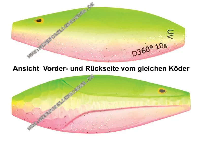 Die Forelle 10g -Version ist für Put & Take- Angeln am Forellen See konzipiert. Wenn die Fische vorsichtig beißen kann der D360 °mit extrem langsamen Tempo gefischt werden. Die verschiedenen Kontrastfarben auf Vorder und Rückseite machen oft auch einen großen Unterschied aus. Aber auch beim Fang von wilden Forellen in alpinen Seen ist dieser kleine D360 ° ist einen Versuch wert.