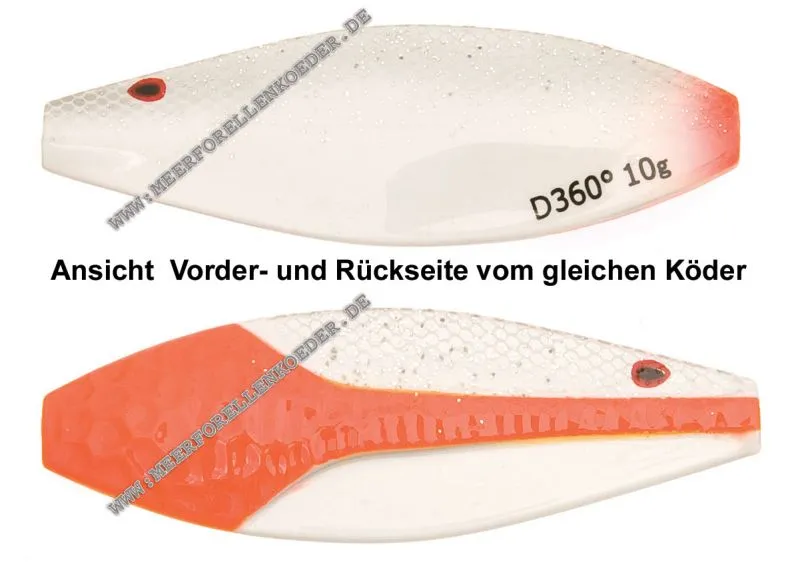 Die Forelle 10g -Version ist für Put & Take- Angeln am Forellen See konzipiert. Wenn die Fische vorsichtig beißen kann der D360 °mit extrem langsamen Tempo gefischt werden. Die verschiedenen Kontrastfarben auf Vorder und Rückseite machen oft auch einen großen Unterschied aus. Aber auch beim Fang von wilden Forellen in alpinen Seen ist dieser kleine D360 ° ist einen Versuch wert.