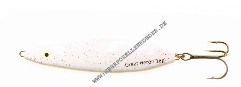 Das besonder an diesem neuen Wobbler ist die stark ausgeprägte S-Form, dadurch hat der Köder ein sehr lebhaftes Spiel und viel Aktion. Der Great Heron Wobbler imitiert eine kleine lebendige Sprotte oder einen jungen Herring und ist daher sehr fängig bei der Jagt auf die Meerforelle. Der Wobbler wurde vom Kinetic Team viel getestet bevor er in 2010 in Produktion ging. Ausgestattet ist der Great Heron nur mit besten Komponenten wie z.B. VMC 9649 BN Drillingen und doppelten rostfreien Sprengringen. In seinem "Geburtsland" Dänemark hat er schon viele Wolfsbarsche , Meerforellen , Hornhechte  und Dorsch überlistet.