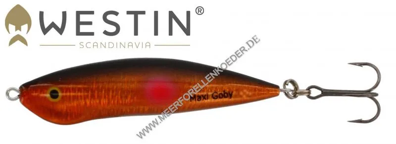 Bei der Entwicklung des Westin Mini Goby war es die Aufgabe einen sehr leichten Wobbler zu entwickeln mit dem man auch große Distanzen werfen kann. Der Maxi Goby ist eine größere, aber auch sehr andere Version des Mini Goby Wobblers. Auch dieser Meerforellenkoeder wurde von Tom Schmidt konzipiert. Weil so viele Meerforellen, Seeforellen und Saibling mit dem Mini Goby gefangen wurden, haben sich viele Angler eine größere Version gewünscht. Mit der Einführung der Maxi Goby erfüllen wir ihren Wunsch. Der Maxi Goby basiert auf dem gleichen einzigartigen Design ist aber aus ABS-Kunststoff mit integrieren Ultra-Sonic Rassel Kugeln gemacht. Die Rattle Balls sollen auch bei Trüben Wasser Forelle zum Wobbler und an den Haken locken. Seine unregelmäßige Bewegung im Wasser und das sehr langsamen Tempo mit dem der Wobbler im Flachem gefischt werden kann machen ihn unverzichtbar für jeden Meerforellenangler. Bei gelegentliche Spin Stopps oder Pausen sinkt der Maxi Goby flatternd ab.