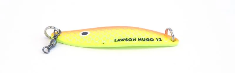 Der Hugo Blinker ist ein kleiner Blinker mit agilem Lauf. Durch die Kompakte Form kann man den Blinker auch bei Wind noch gut werfen. Alle Lawson Blinker sind mit rostfreien Sprengringen und sehr scharfen schwarzen tournament  Drillingshaken ausgestattet. Es gibt den kleinen Hugo Meerforellenverführer in 10 erprobten Farben. Bei kaltem Wetter wenn die Forellen noch nach kleinen Happen jagen ist dieser Köder besonders gut aber der Hugo fängt auch im Sommer noch Meerforellen.