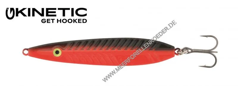 Der Kinetic Nakken ist ein dünner flacher Blinker der zu Ende hin dicker wird. Durch dieses Zusatzgewicht am Schwanzende lassen sich die Köder sehr gut werfen und zeigen beim Spinstop ein verführerisches abtaumeln. Dieser Köder wurde für den Spinstop entwickelt. Kein anderer Köder sinkt verführerischer ab. Die Kinetic Mefo-Blinker sind mit chemisch geschärften Drillingen ausgestattet. Der Blinker imitiert einen kleinen Sandaal und sollte immer mit Spinstop gefischt werden. Ziel der Entwicklung war es, das man mit dem neuen Kinetic Meerforellen-Köder möglichst weit werfen kann. Deshalb ist der Nakken auch dünner als andere Blinker und hat mehr Gewicht am Schwanzende. Mit dem Nakken Meerforellenblinker imitiert man einen kleinen verletzten Fisch und reizt so die Meerforellen zum Biss.