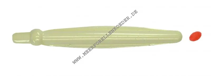 Der Torpedo Blinker ist etwas außergewöhlich denn er hat eine völlig neue Form. Soetwas haben die Forellen sicher noch nie gesehen. Der Köper des Meerforellenköders ist zigarrenförmig, hat am hinteren Ende eine Verdickung ( Knoten ) und rechts und Links zwei schmale Flügel. Duch diese Form ist der Köder sehr aerodynamisch und fliegt wie ein Pfeil durch die Luft. Der Torpedo sackt im Wasser nicht ganz so schnell durch wie sei schlanker Bruder der Missil. Trotz der ungewöhnlichen Form hat der Blinker schon viele Meerforellen überlistet aber man weiß nicht genau ab die Fische nur neugierig sind oder darin ein Beutetier erkennen. Man muß den Durchlaufblinker etwas schneller als andere, breitere Blinker führen sonst sackt er zu stark durch und fängt eher Kraut statt Fisch. Wenn ich den Lauf des Meerforellenblinkers beschreiben sollte so kann man sagen das der Köder sehr geradlinig läuft mit einem leichten flattern und zittern. Man kann dem Mefoblinker schon fast als NO ACTION Köder bezeichnen da er nur sehr wenig Aktion zeigt. Warum dieser Meerforellenköder trotzdem so erfolgreich ist kann man sehr gut sehen wenn man einmal echte Tobiasfische beobachtet. Diese Fische schwimmen wie ein Stock durchs Wasser und nur die Schwanzflosse zeigt etwas Aktion. Tobis sind die Lieblingsspeise der Meerforellen und diese wollen Sie nicht entkommen lassen. Der Torpedoblinker imitiert das Bewegungsmuster der Tobiasfische perfekt und überlistet so die Forellen. Also immer wenn Sie beim Fischen ein Schwarm Tobiasfische sehen solten Sie es mal mit einem Torpedo probieren. Aber wie gesagt dieser Köder fängen nicht nur gut Fisch sondern sie lassen sich auch noch sehr gut werfen. In der Inliner Variante ist der Köder noch etwas erfolgreicher da sich die Fische im Drill sogut wie nicht aushebeln können.