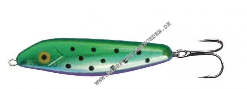 Der Orginal Vicke Wobbler  aus Schweden fängt seit 25 Jahren ! super Meerforellen und Lachse . Anders als die bekannte Kopie , ist er mit weniger Rasselkugeln ausgestattet die einen dumpfen Klang erzeugen .