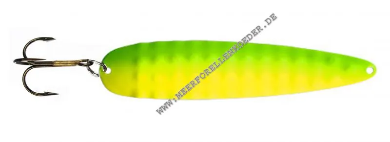 Der Gladsax Ismo Mag ist wahrscheinlich der meistverkaufte Trolling Löffel für den Fang von Lachs entlang der Ostseeküste Schwedens. Er wird in Schweden gefertigt ist von Hand bemalt und unglaublich beliebt. Am besten schleppt man den MAG zwischen 2,4 bis 3,1 Knoten. Für die Fischerei bei niedrigeren Geschwindigkeit 2,5 bis 2,7-Knoten sollte man einen Einzelhaken Größe 4/0 oder 5/0 mit 2 Sprengringen verwenden. Hergestellt ist der Ismo Magnum aus ein dünnes Edelstahl. Durch diese dünne Platte hat der Spoon viel mehr Bewegung und einen sehr schönen Lauf. Die Form des Ismo kann man so beschreiben der Blinker ist Hinten breiter als Vorn, leicht gewölbt und hat am Schwanz einen leichten Knick. Der Lachslöffel wird zusätzlich noch mit einem Muster geprägt. Dieses Muster erzeugt im Wasser viele Lichtreflexe und kleine Turbulenzen. Die viel getestete und erprobte Form ist zusammen mit dem geringen Gewicht sicher auch dafür Verantwortlich, dass der Köder einem einzigartigen Lauf im Wasser hat und so viele dicke Ostseelachse und Meerforellen überlistet.