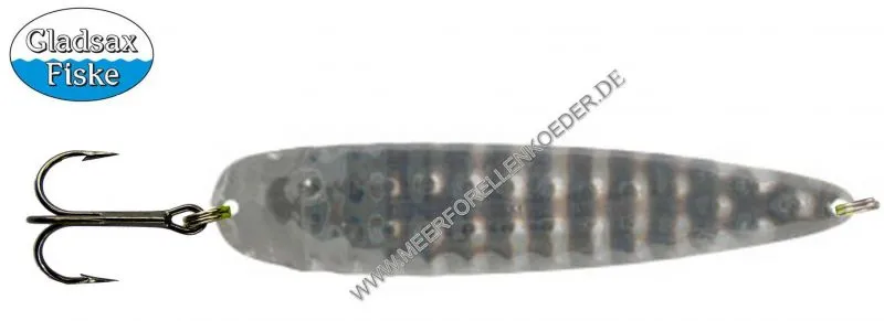 Der Gladsax Ismo Mag ist wahrscheinlich der meistverkaufte Trolling Löffel für den Fang von Lachs entlang der Ostseeküste Schwedens. Er wird in Schweden gefertigt ist von Hand bemalt und unglaublich beliebt. Am besten schleppt man den MAG zwischen 2,4 bis 3,1 Knoten. Für die Fischerei bei niedrigeren Geschwindigkeit 2,5 bis 2,7-Knoten sollte man einen Einzelhaken Größe 4/0 oder 5/0 mit 2 Sprengringen verwenden. Hergestellt ist der Ismo Magnum aus ein dünnes Edelstahl. Durch diese dünne Platte hat der Spoon viel mehr Bewegung und einen sehr schönen Lauf. Die Form des Ismo kann man so beschreiben der Blinker ist Hinten breiter als Vorn, leicht gewölbt und hat am Schwanz einen leichten Knick. Der Lachslöffel wird zusätzlich noch mit einem Muster geprägt. Dieses Muster erzeugt im Wasser viele Lichtreflexe und kleine Turbulenzen. Die viel getestete und erprobte Form ist zusammen mit dem geringen Gewicht sicher auch dafür Verantwortlich, dass der Köder einem einzigartigen Lauf im Wasser hat und so viele dicke Ostseelachse und Meerforellen überlistet.
