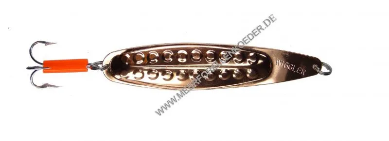 Seit 1950 ist der Wiggler Blinker der Klassische Kunstköder in Schweden. Der Blinker besteht aus dünnem Blech mit einem angegossenem Bleikern. Diese Materialkombination erlaubt weite zielgenaue Würfe und ein attraktives Köderspiel beim einholen. Hornhechte , Wolfsbarsch und Meerforelle können diesem Top Köder nur schwer wiederstehen. Ausgestattet mit hochwertigen rostfreien Springringen und originalen Mustad 3551 Drillingen.